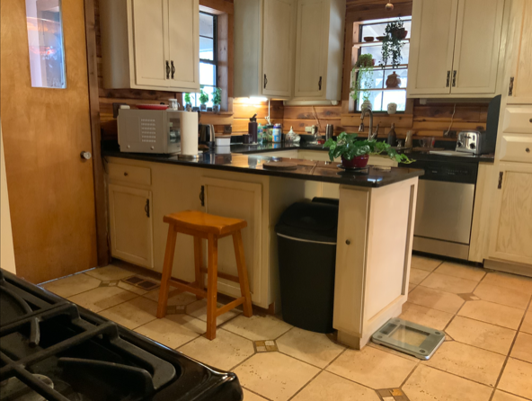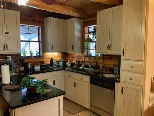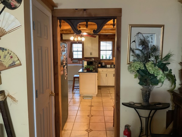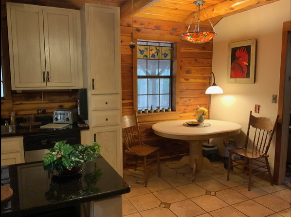Adjacent to the basement doorway is the kitchen with hand-hewn cedar beams, ceiling fan and mini-split. AllĀ  updated with custom cabinetry in glazed ivory, porcelain tile flooring and granite counter tops. Notice the intricate design of the tile flooring. Each and every tile required a cut to complete the design. The dining table and four chairs stay as do all the appliances, refrigerator, propane stove, dishwasher and microwave, if wanted.