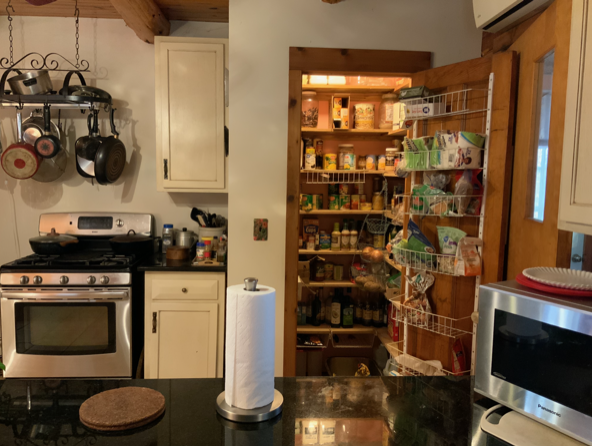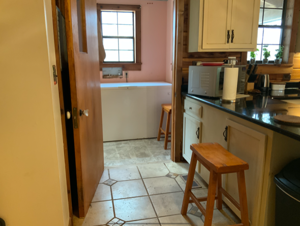 At the far end of the kitchen to the left is a large walk-in pantry. Beyond the door next to the pantry is a storage room with a large chest freezer (also stays) and a standing cabinet. There is a washer and dryer connection here as well. There is also a small, unobtrusive pet door as well as a back door leading to an open, outside deer-watching deck. The home has a total of five doors leading to the outside.