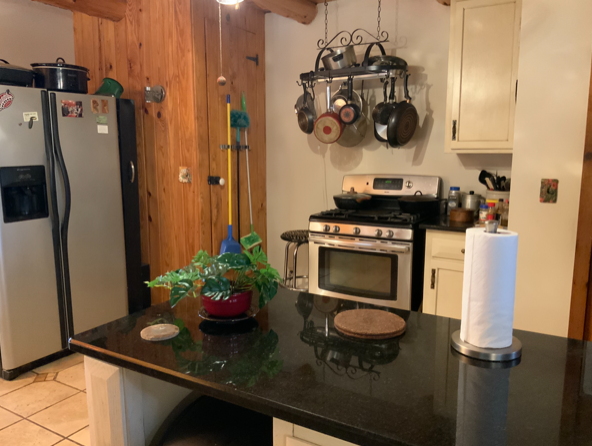 The counter tops are bull-nosed black granite with beige, grey and brown flecks. You will be challenged to find a seam. The walk-in pantry has three walls of shelves inside for food storage as well as a rack on the inside of the door. There is an extra pantry adjacent to the refrigerator and stove. The freezer/fridge has an ice maker in the door and stands next to a tall slider cabinet perfect for coffee, tea, spices, etc. All appliances are dent and scratch free stainless steel.