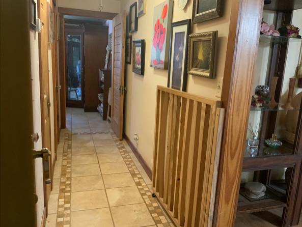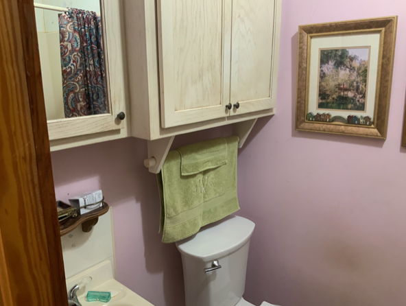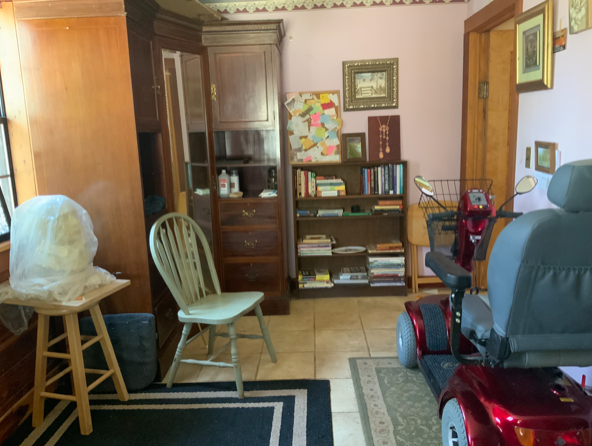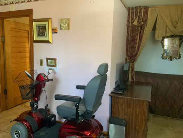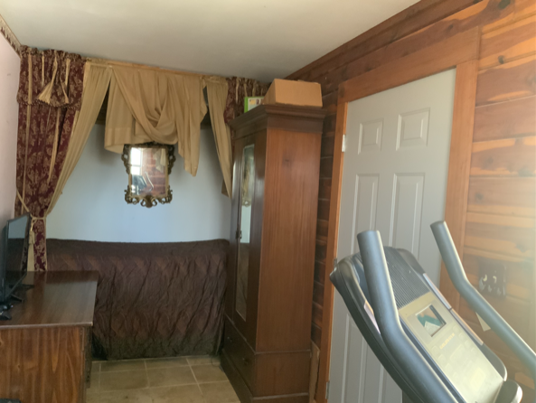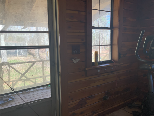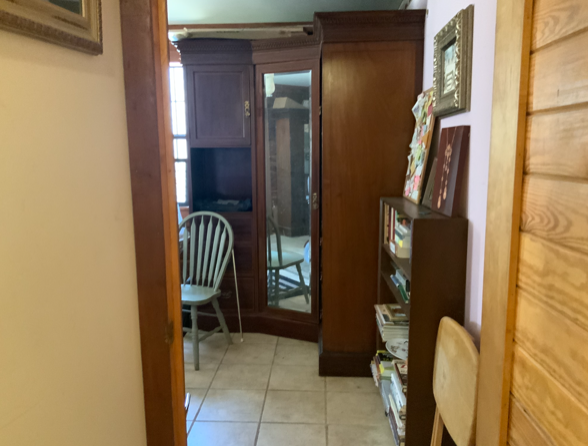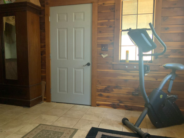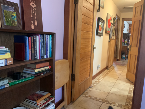 The door leads outside to the covered back porch with the spa to the left at the end of the porch. If used as a guest bedroom, guests can access the spa and the back yard without disturbing others in the house. The porch curves around to the right leading to the back door of the storage room and into the kitchen.