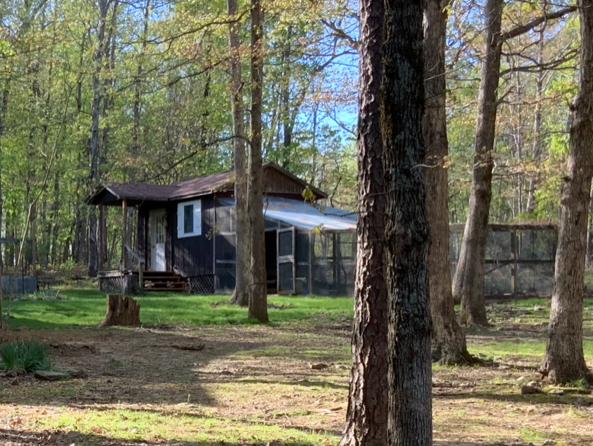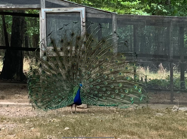 And- there is Henry. A beautiful indigo peacock. He would prefer to stay in his home if the new owners would have him. He will do his best to rid the place of ticks and insects in return for a little bird seed/sunflower seed and dry kitty kibble every day. Henry will eat from your hand once he gets to know you but OUCH he pecks hard. He often goes into a ‘fanning frenzy’ and will fan a car, the trash can, a towel hanging on the porch rail, etc. He would probably like a female companion but he will fight another male peacock to the death. He enjoys the company of chickens and Guinea fowl but definitely not roosters or male Guineas. Art patrons on the studio tour look forward to seeing Henry every year!