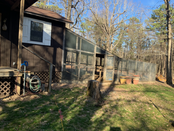 The chicken house is called ‘the Martha Stewart Chicken House’! It’s well insulated from top to bottom and has three windows with cage wire screens to prevent varmint entry. It also has a no-freeze well water spigot. It’s often been mistaken for a small apartment. The wire surrounding the pen area is a special order, heavy duty, hardware cloth wire and is buried in concrete, 1-1/2’ into the ground.